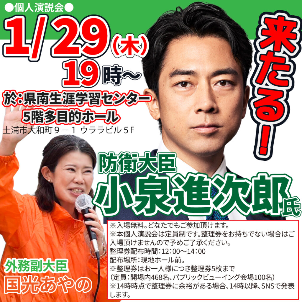 小泉防衛大臣が土浦に応援弁士として来てくださいます!